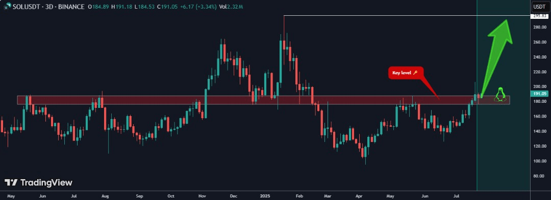 $SOL hat gerade ein wichtiges Schlüsselniveau im Bereich von $188–$190 durchbrochen — ein Widerstand, der den Preis im letzten Jahr mehrfach zurückgehalten hat. Jetzt, mit einer starken 3D-Kerze, die über dieser Zone schließt, ist SOL offiziell im Ausbruchsterritorium.