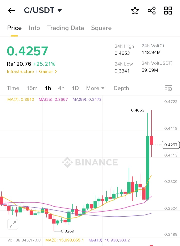 Der Markt wachte heute zu einem massiven Preisanstieg im C/USDT-Paar auf, mit einem Preissprung von +25,21% in den letzten 24 Stunden, der einen Höchststand von 0,4653 $ erreichte, bevor er auf 0,4257 $ zurückfiel.