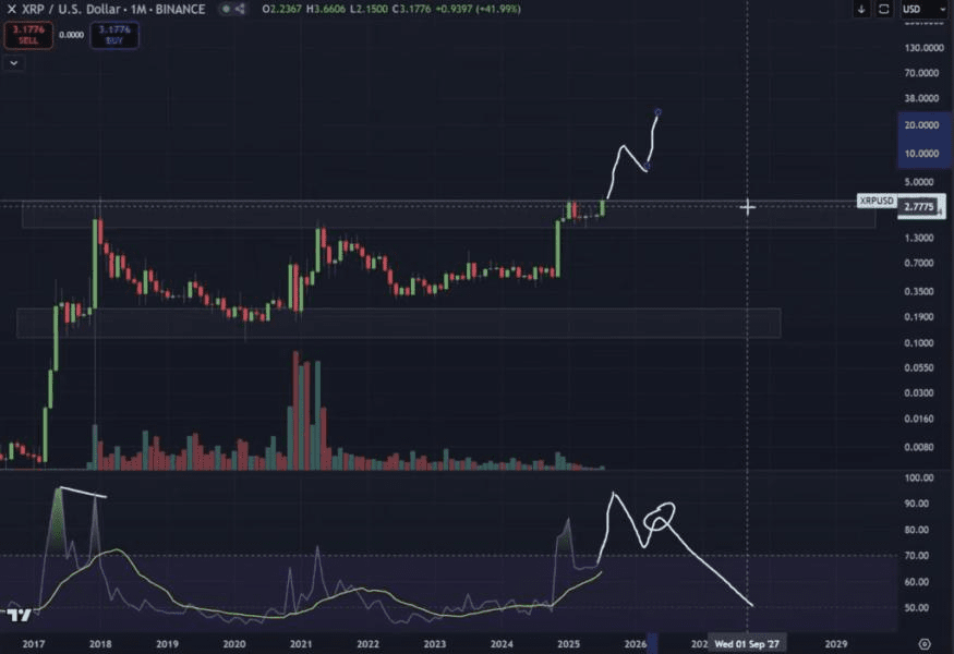 Die Unterstützung des bullischen Falls ist ein technisches Signal, das viele Marktbeobachter übersehen haben: eine Rückkehr des monatlichen Relative Strength Index (RSI) von XRP in die überkaufte Zone, die historisch ein Vorläufer parabolischer Anstiege war. Im Zyklus 2017 ging einem ähnlichen RSI-Muster eine Bewegung von über 700 % voraus, und selbst eine „konservative“ Wiederholung könnte XRP auf weit über 10 $ heben, erklärte er. „Wenn wir hier ein höheres Hoch im monatlichen RSI machen, deutet das für mich nicht darauf hin, dass die Bewegung vorbei ist“, sagte er und betonte, dass die Momentum-Indikatoren fest im bullischen Bereich bleiben.