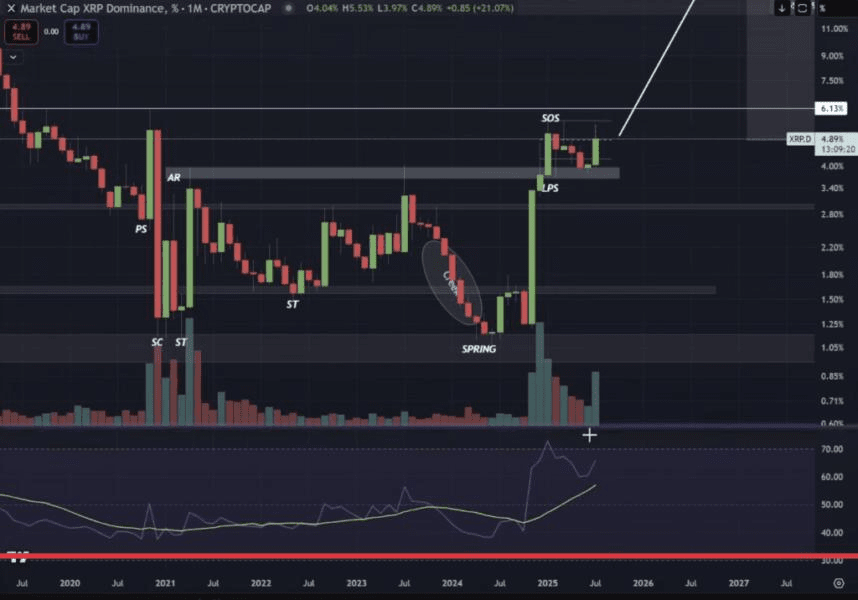 Wenn man sich die XRP-Dominanz ansieht – ein Maß für den Marktanteil von XRP im Vergleich zum Rest der Kryptowährungen – stellte CryptoInsightUK fest, dass der Token den Mittelpunkt eines Bereichs hält, der über dem liegt, was er als die „Stärkezeichen“-Phase bezeichnet. „Wir haben diesen Bereich über der Wyckoff-Akkumulation geschaffen... Auch dort sieht es gut aus“, sagte er.