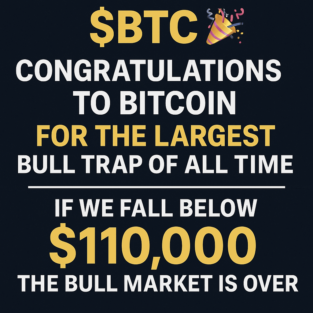Herzlichen Glückwunsch an Bitcoin$BTC , dass er möglicherweise die größte Bullenfalle aller Zeiten aufgestellt hat. Wir haben gerade einen falschen Ausbruch über ein 7-Jahres-Hoch erlebt — und der Markt hat die Falle geschnappt.