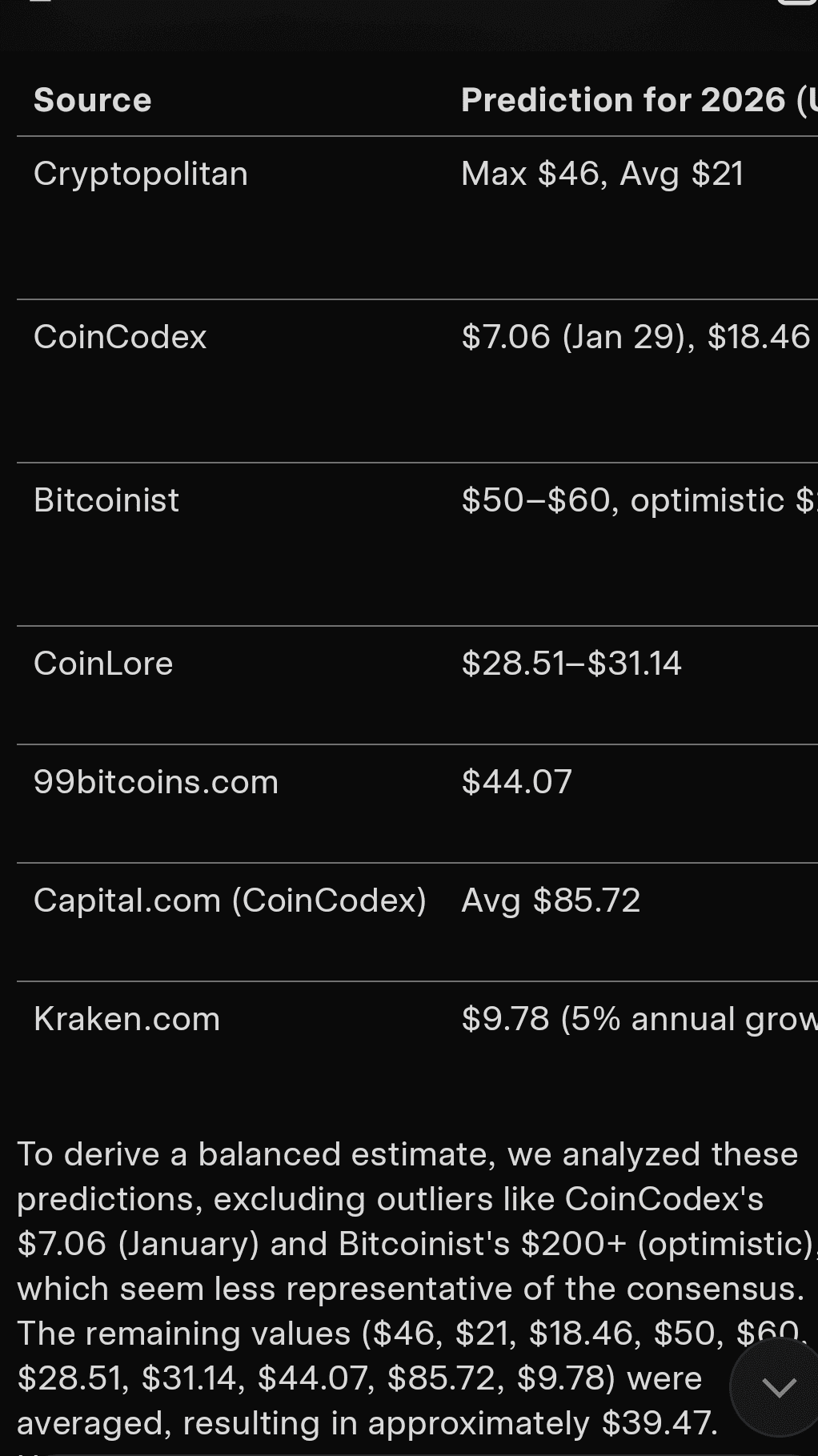 Um eine ausgewogene Schätzung zu erzielen, haben wir diese Prognosen analysiert, wobei Ausreißer wie die 7,06 US-Dollar von CoinCodex (Januar) und die über 200 US-Dollar von Bitcoinist (optimistisch) ausgeschlossen wurden, da sie weniger repräsentativ für die Konsensmeinung erscheinen. Die verbleibenden Werte (46, 21, 18,46, 50, 60, 28,51, 31,14, 44,07, 85,72, 9,78) wurden durchschnittlich berechnet, was etwa 39,47 US-Dollar ergibt. Berücksichtigt man jedoch den Median (Durchschnitt der 5. und 6. Werte, 31,14 und 44,07, was 37,61 ergibt), erhält man eine robustere zentrale Tendenz, da die Verteilung verzerrt ist. Für einen Bereich liegt die Konzentration um 20 bis 50 US-Dollar, was den meisten Prognosen entspricht und die spekulative Natur berücksichtigt.