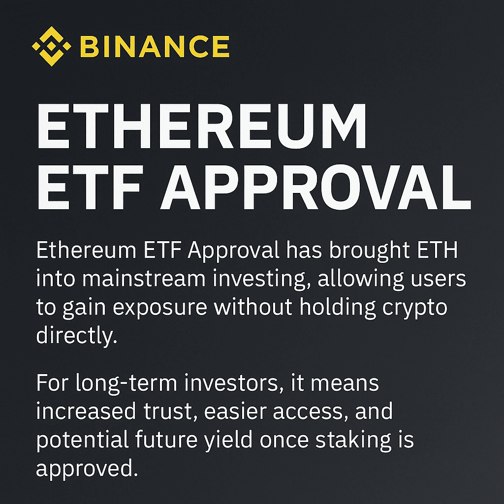 🚀 Die Genehmigung des Ethereum-ETFs hat ETH in das Mainstream-Investieren gebracht, was es den Nutzern ermöglicht, ohne direkten Besitz von Krypto eine Beteiligung zu erlangen. Für langfristige Investoren bedeutet dies erhöhtes Vertrauen, einfacheren Zugang und potenzielle zukünftige Erträge, sobald das Staking genehmigt ist.
