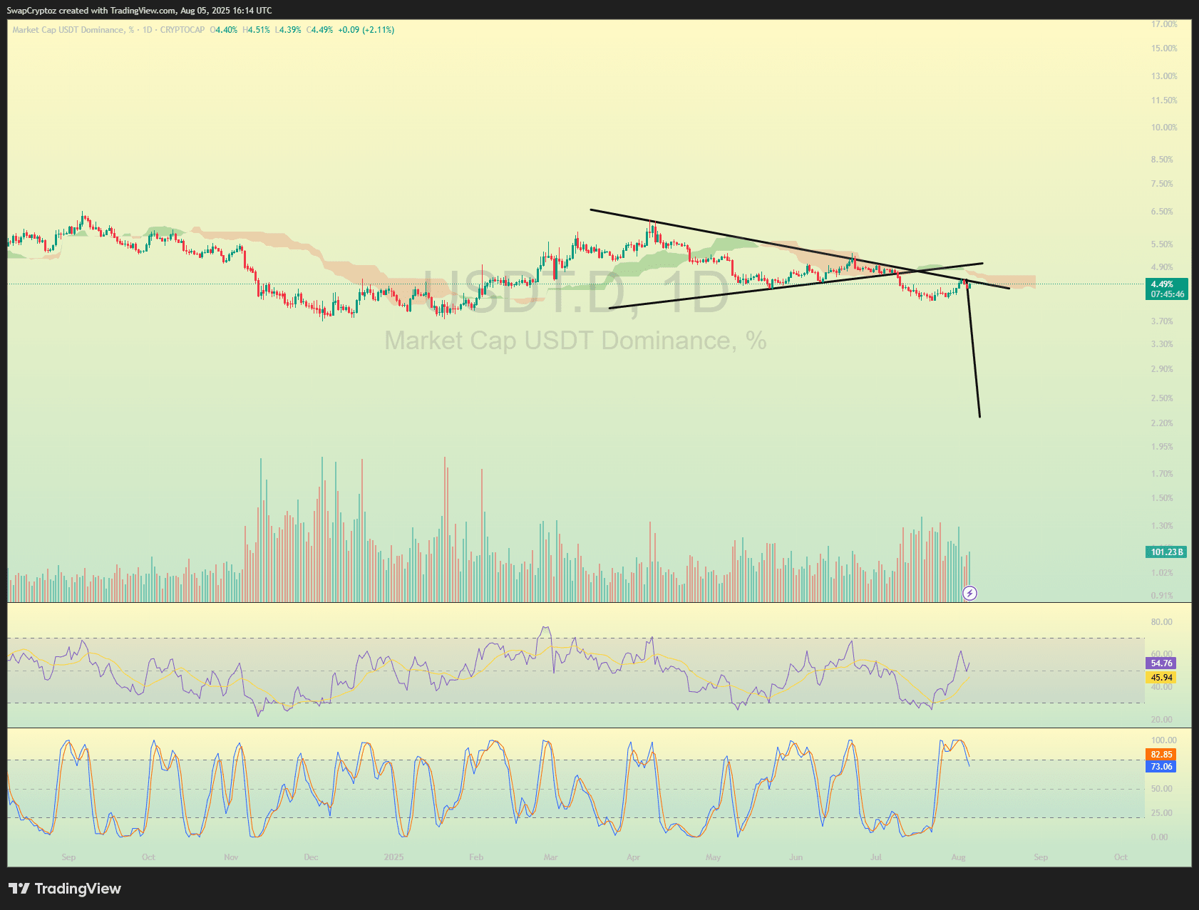 USDT.D sieht sich erneut starkem Widerstand an seiner Widerstandstrendlinie gegenüber, wobei der RSI eine klare bärische Divergenz zeigt und der Stochastik-RSI tief im überkauften Bereich sitzt. Momentum lässt nach und das Volumen fällt—klassische Anzeichen für einen möglichen Rückgang. Wenn USDT.D sich von hier zurückzieht, können wir erwarten, dass BTC bullish wird, was Momentum bei den Top-Altcoins auslösen könnte. Einer, den man genau beobachten sollte? DOGE, das diese Welle wunderbar reiten könnte, wenn der Rückgang bestätigt wird.