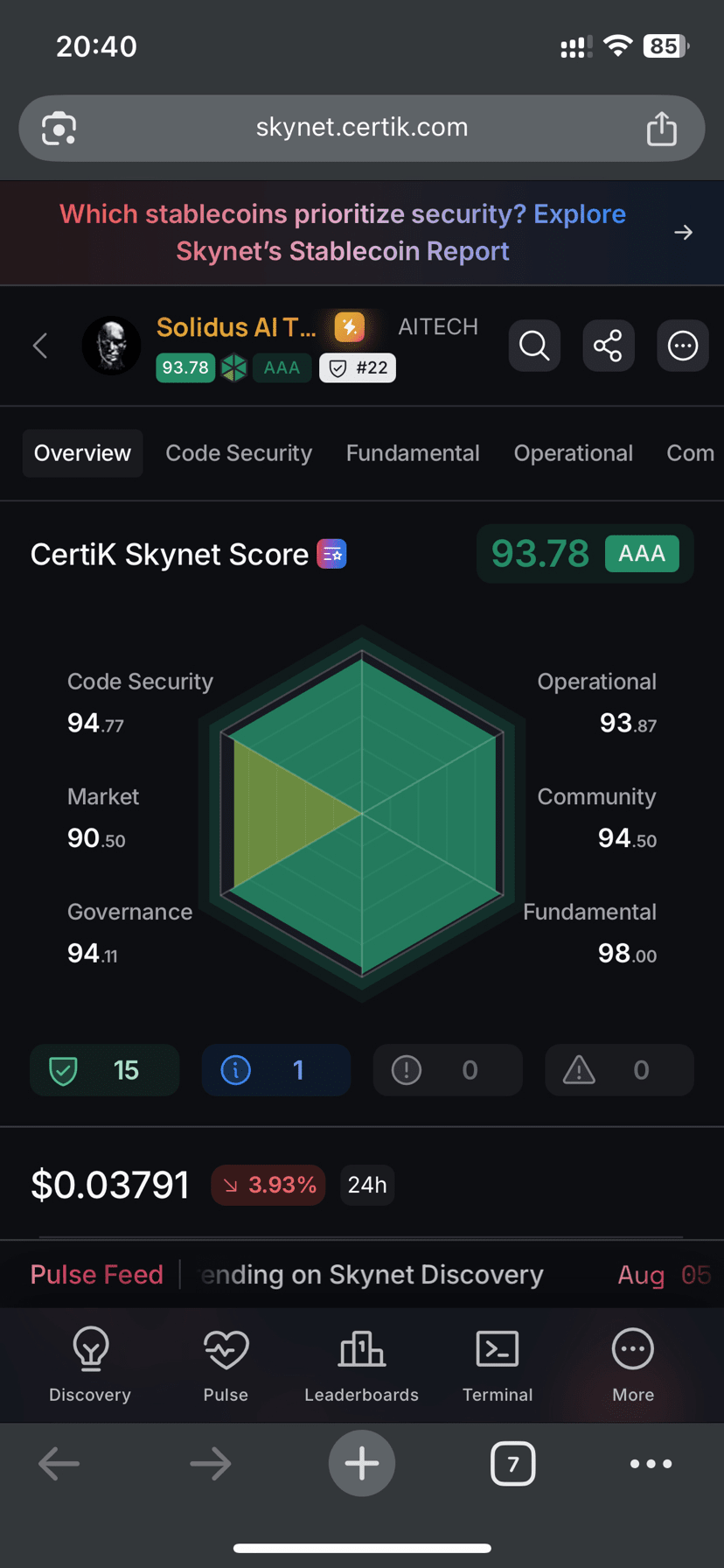 AAA-Bewertung & 93,78 Skynet-Score: Dies platziert AITECH in der Elite-Kategorie von Web3-Projekten und spiegelt starke Sicherheit und Zuverlässigkeit wider.