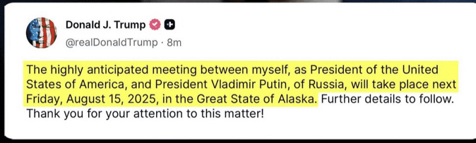 In einer wegweisenden diplomatischen Entwicklung hat Donald J. Trump $TRUMP angekündigt, dass er nächsten Freitag, den 15. August 2025, im Großen Staat Alaska mit dem russischen Präsidenten Wladimir Putin zusammentreffen wird. Das Treffen, das bereits weltweite Aufmerksamkeit erregt hat, wird voraussichtlich eine Vielzahl von Themen ansprechen, die internationale Beziehungen, Handel und Sicherheit betreffen.$TRUMP