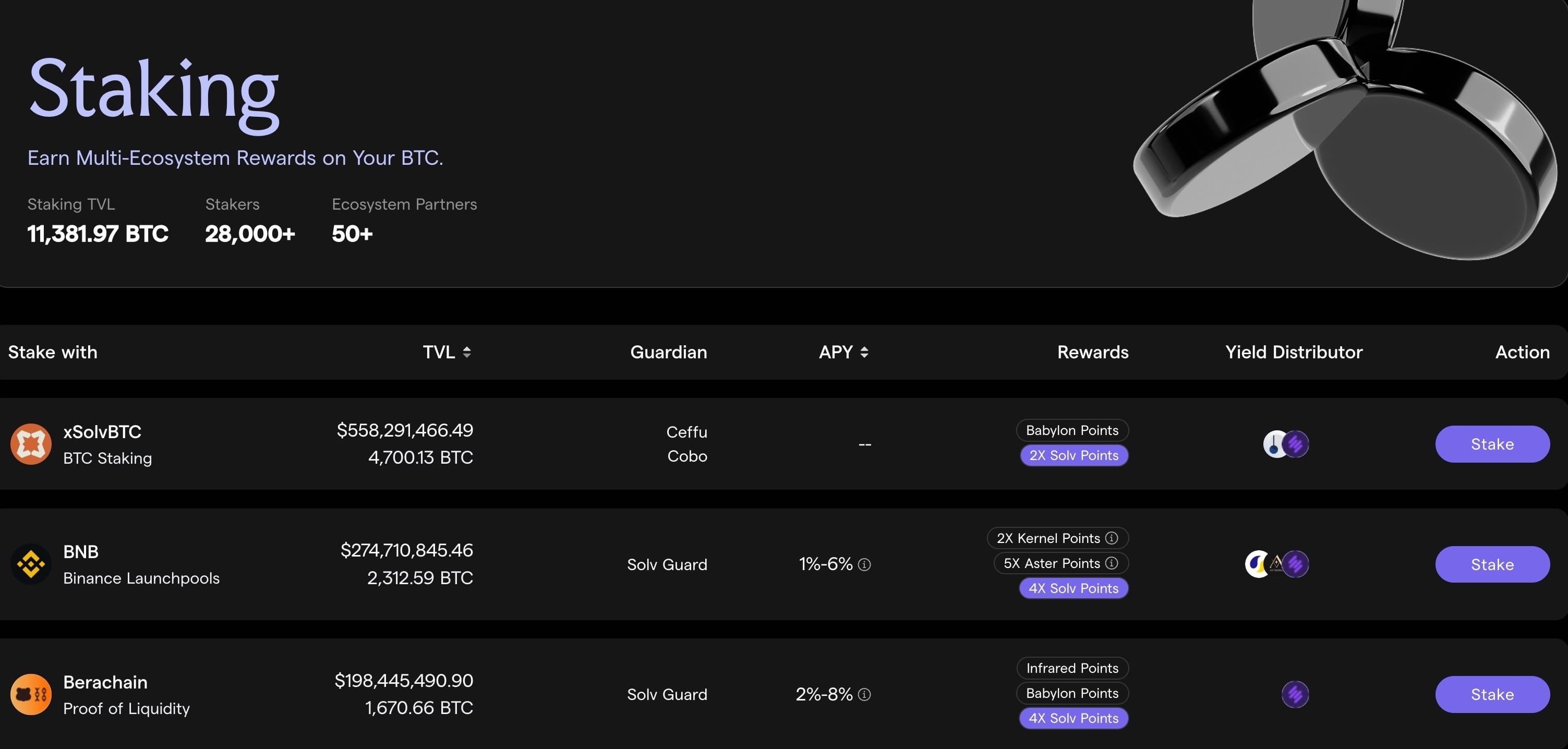 „Das hat sehr viel damit zu tun! Solv ist ein Bitcoin-Staking-Protokoll, das dir hilft, deine BTC in ertragbringende Vermögenswerte zu verwandeln. Einfach gesagt, du steckst BTC hinein und erhältst ein 1:1 gebundenes SolvBTC, und dann bekommst du Liquid Staking Tokens SolvBTC.LSTs, um auf verschiedenen DeFi-Plattformen Geld zu verdienen, die Mitgift stammt aus diesen Erträgen!“