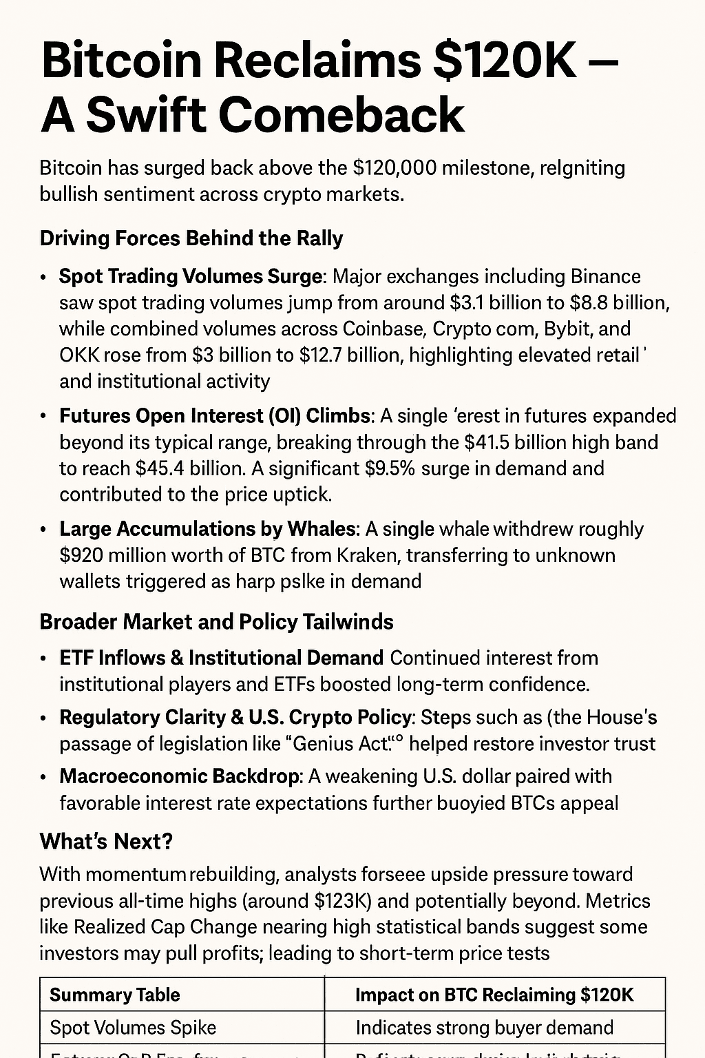 Die Rückkehr von Bitcoin auf das $120K-Niveau wird durch robuste Marktaktivitäten unterstützt – von Einzelhandels- und institutionellen Flüssen bis hin zu Walakkumulationen und klareren politischen Signalen. Das Zusammenspiel dieser Faktoren deutet auf erneuertes Vertrauen und Potenzial für weiteres Upside hin – jedoch bleibt aufgrund der typischen Volatilität von Kryptowährungen Vorsicht geboten.