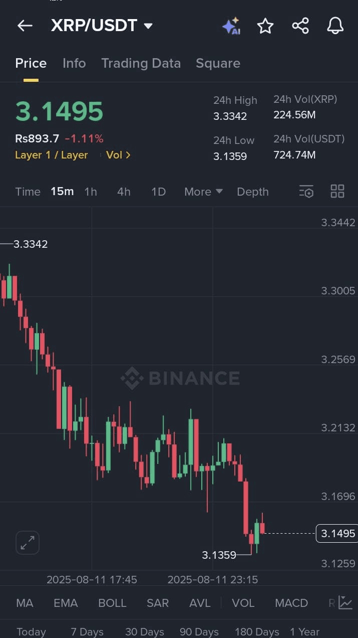 XRP befindet sich in einem stetigen Rückgang und fiel kürzlich auf ein Intraday-Tief von 3.1359, bevor es einen kleinen Rückschlag gab. Dennoch dominiert weiterhin der bärische Momentum, und ein Fall unter die 3.1350-Marke könnte die Tür für weitere Abwärtsbewegungen zu tieferen Unterstützungsbereichen öffnen.