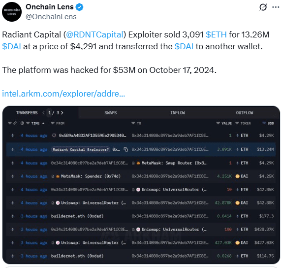 Laut Onchain Lens-Daten hat der Hacker seine Ethereum-Bestände zum Preis von 4.291 $ pro ETH in DAI-Stablecoins umgewandelt, was insgesamt 13,26 Millionen $ ausmachte.