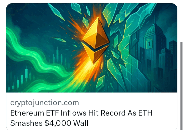 Ethereum ETF-Zuflüsse haben gerade einen Rekordhoch erreicht, während ETH die 4.000-Dollar-Marke überschreitet.