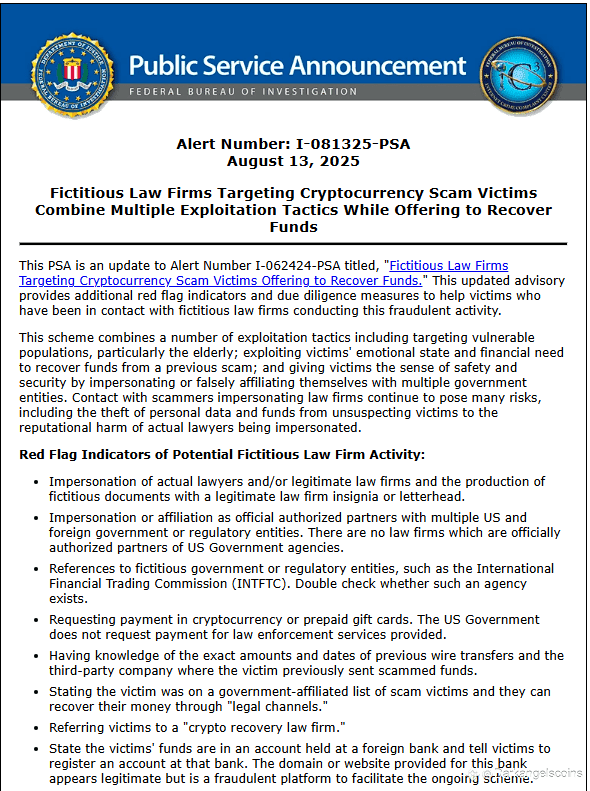 Das FBI warnt, dass Betrüger sich als Anwälte und offizielle Stellen ausgeben, um Opfer von Krypto-Betrug zu täuschen, sie versprechen, Gelder zurückzuholen, verlangen aber Zahlungen in Kryptowährungen oder Geschenkkarten, und verwenden gefälschte Dokumente mit legitimen Logos.