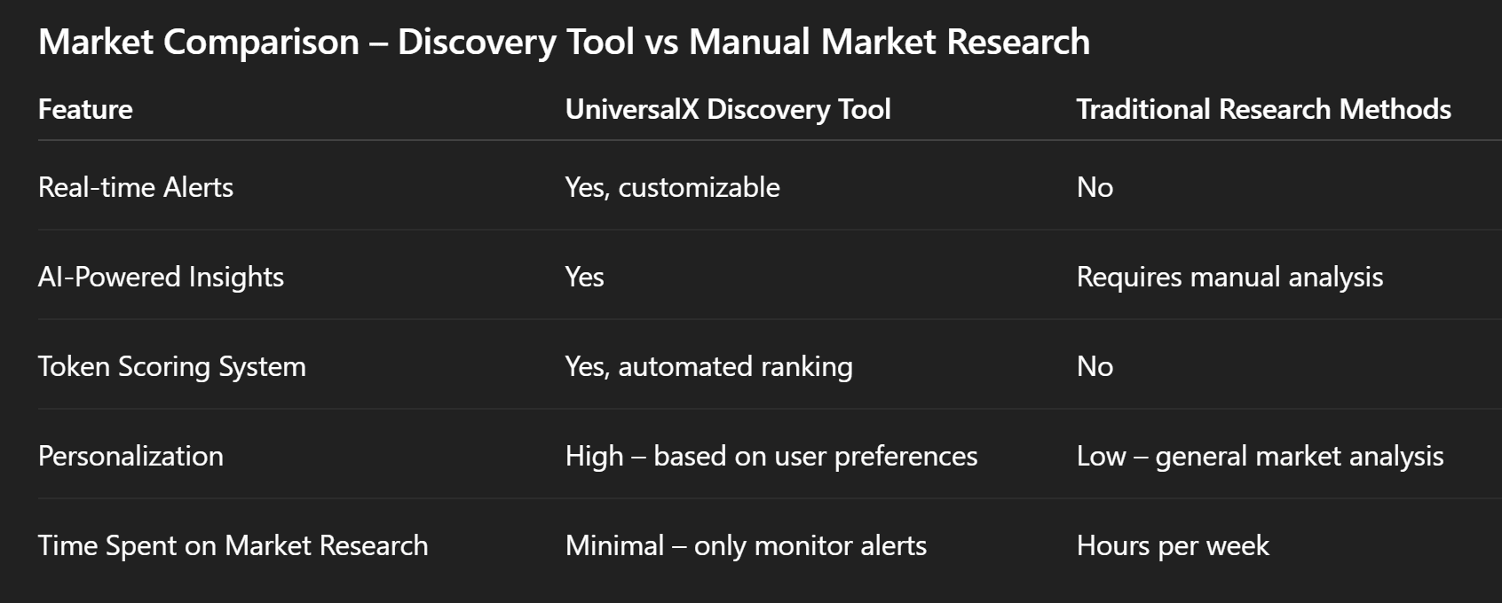 Narratives Beispiel: John, ein erfahrener Händler, verbringt normalerweise jede Woche Stunden mit der Analyse von Marktdaten. Nachdem er das Entdeckungstool von UniversalX verwendet hat, erhält er jetzt Echtzeit-Updates über trendende Token mit hohem Wachstumspotenzial. Dies ermöglicht es ihm, viel schneller informierte Entscheidungen zu treffen, sodass er mehr Zeit hat, sich auf Strategien zu konzentrieren, anstatt Daten zu sammeln.