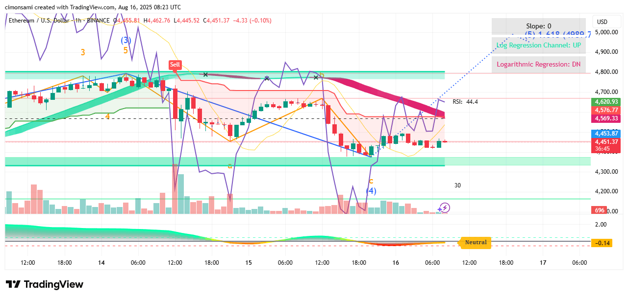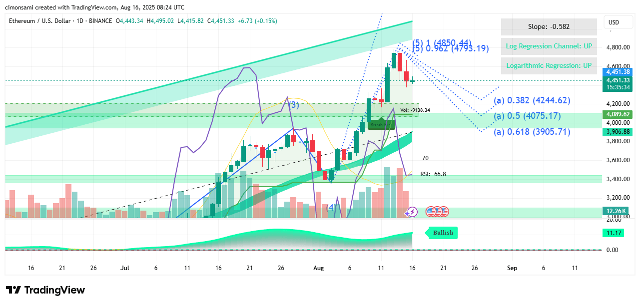 Struktur: ETH hat eine impulsive Welle bis ~4,800 abgeschlossen und zieht sich jetzt innerhalb eines korrektiven Rückzugs zurück.