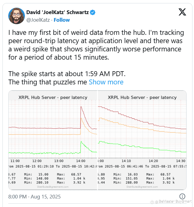 $XRP Ripple's Chief Technology Officer, David Schwartz, hat ein seltsames Anomalie beleuchtet, die er beim Überwachen seines XRPL-Hubs beobachtete. In einem Beitrag, der auf X geteilt wurde, beschrieb Schwartz einen plötzlichen 15-minütigen Anstieg der Peer-Roundtrip-Latenz, der um etwa 1:59 Uhr pazifischer Sommerzeit am 15. August 2025 auftrat.
