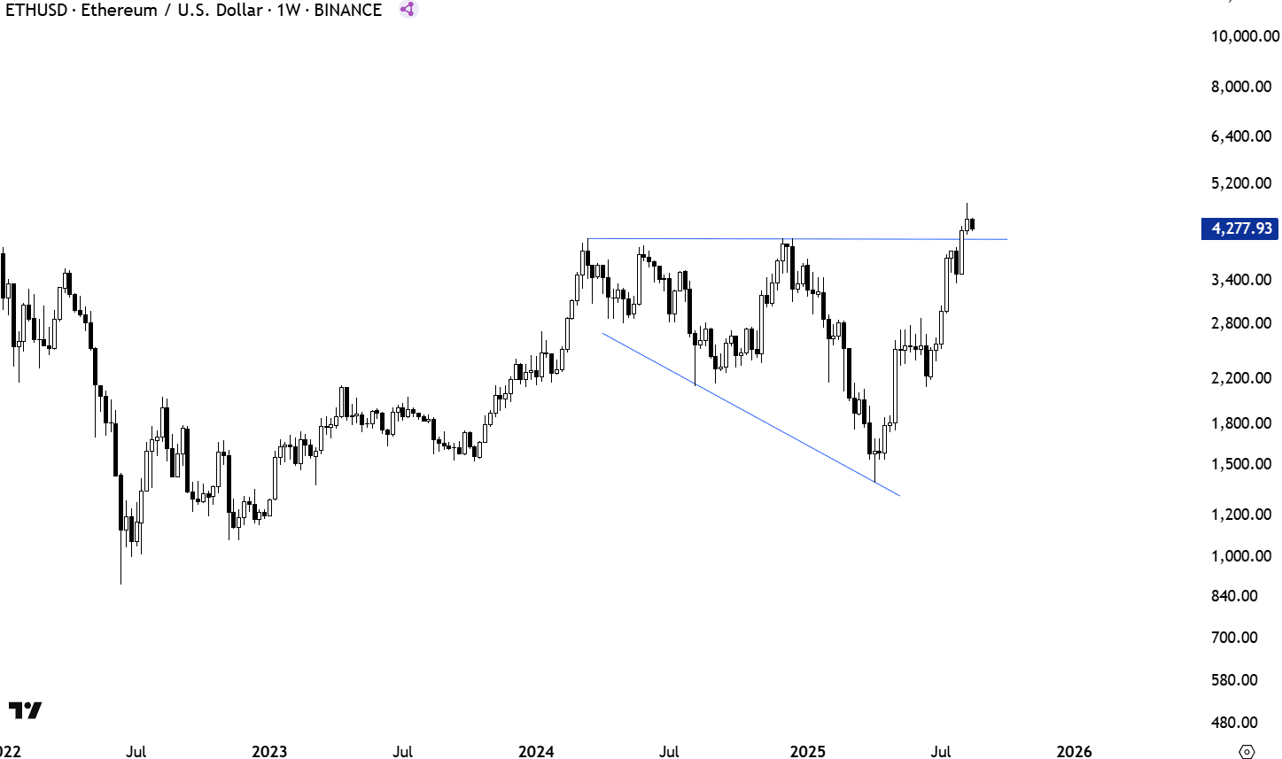 * ETH/USD (aktueller Chart): Wir sehen, wie sich der Preis ein großes bullisches Flaggenmuster oder ein aufsteigendes Dreieck nach einer starken Aufwärtsbewegung bildet. Der Preis konsolidiert sich und stößt dabei gegen den horizontalen Widerstand im Bereich von $4.000-$4.200, während er allmählich eine aufsteigende Unterstützung bildet. Momentan sehen wir, dass der Preis diesen Widerstand durchbrochen hat. Das ist ein sehr starkes Signal.