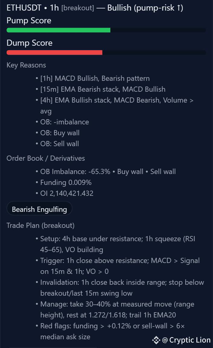 Ethereum$ETH auf dem 1-Stunden-Chart zeigt mehrere bärische Signale, die den Beginn einer Korrekturphase markieren könnten. Während das Gesamtergebnis weiterhin auf ein bullisches „Pump-Risiko ↑“ hindeutet, erzählt die tatsächliche Struktur und der Order Flow eine andere Geschichte — Vorsicht ist geboten.