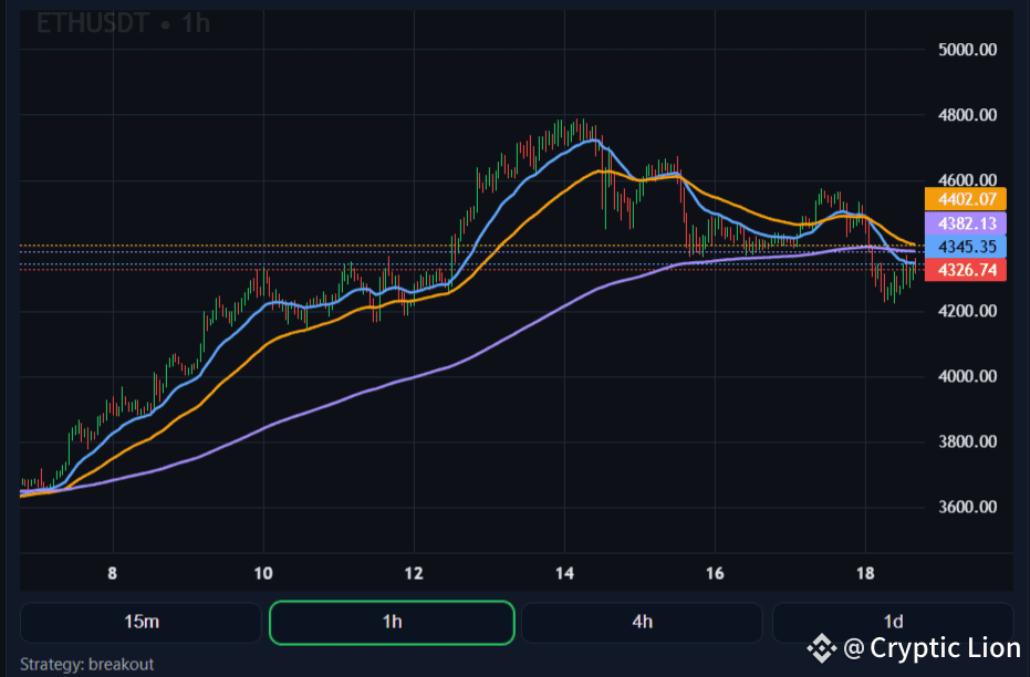 Kurzfristige Ausrichtung: Bärisch. Es sei denn, $ETH erobert schnell $4.480–$4.500 zurück, ist es wahrscheinlich, dass der Preis die Zone $4.200–$4.150 erneut testet. Wenn dieses Niveau nachgibt, wird ein Rückgang auf $4.000–$3.950 sehr wahrscheinlich.