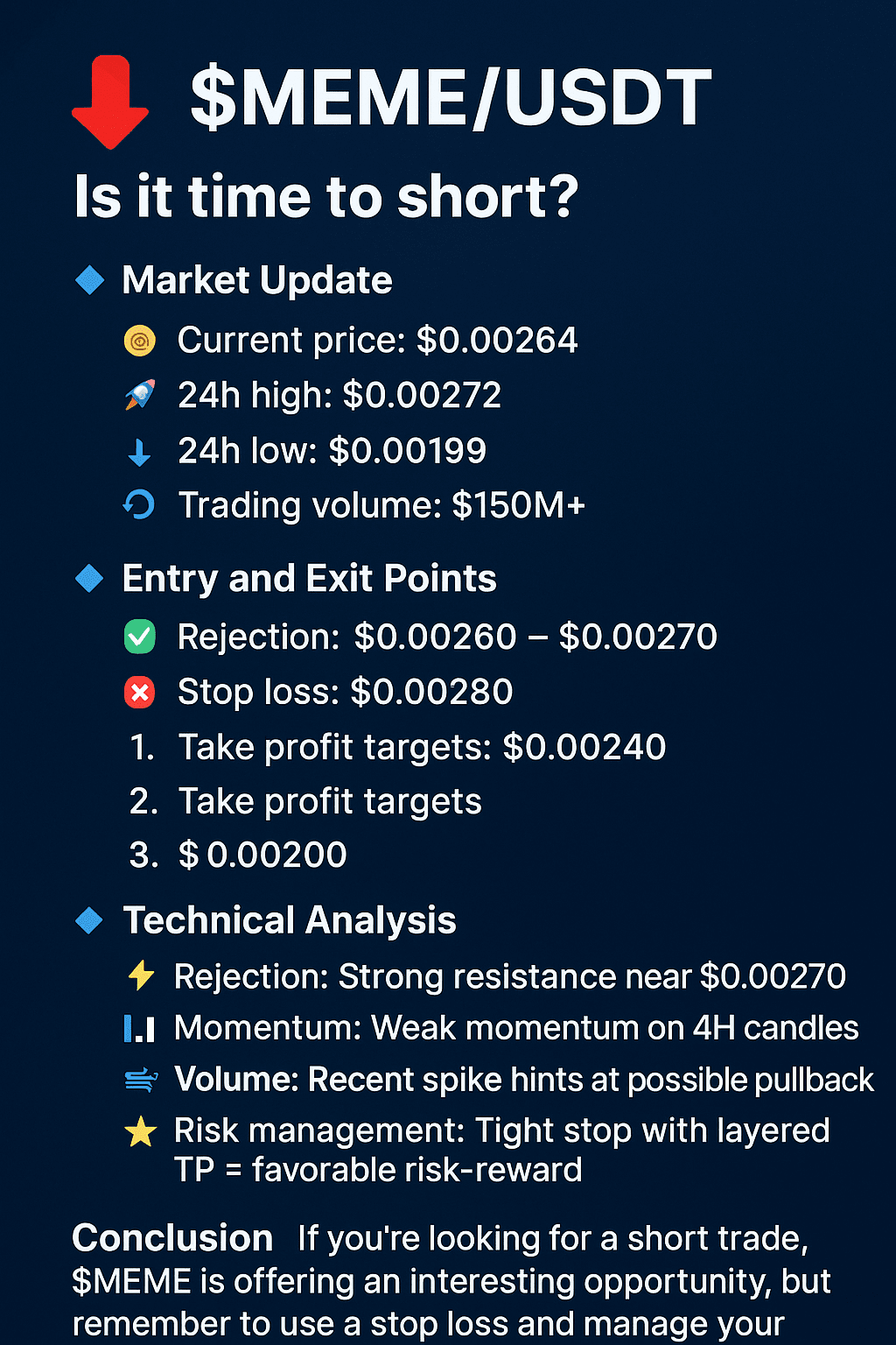 Für Trader, die nach einer Short-Gelegenheit suchen, $MEME präsentiert sich derzeit ein interessantes Setup. Der Markt ist jedoch immer riskant – nutzen Sie Stop-Loss weise und behalten Sie die Kontrolle über Ihre Emotionen.