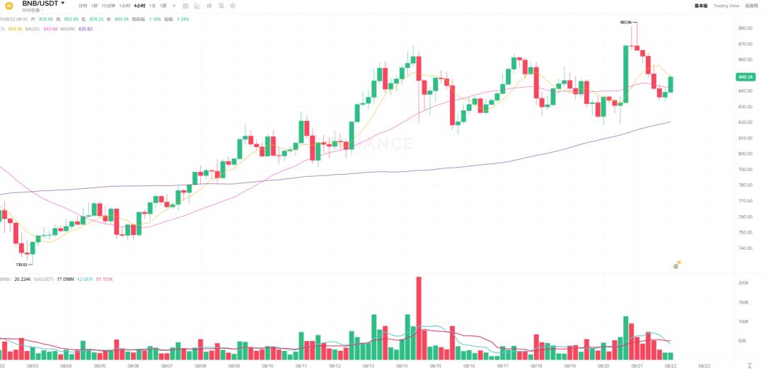 Der Binance Coin [BNB] erreichte am 20. August einen Höchststand von 883 USD, was einen historischen Höchststand (ATH) darstellt, und fiel dann leicht auf etwa 850 USD zurück.#BNB创新高