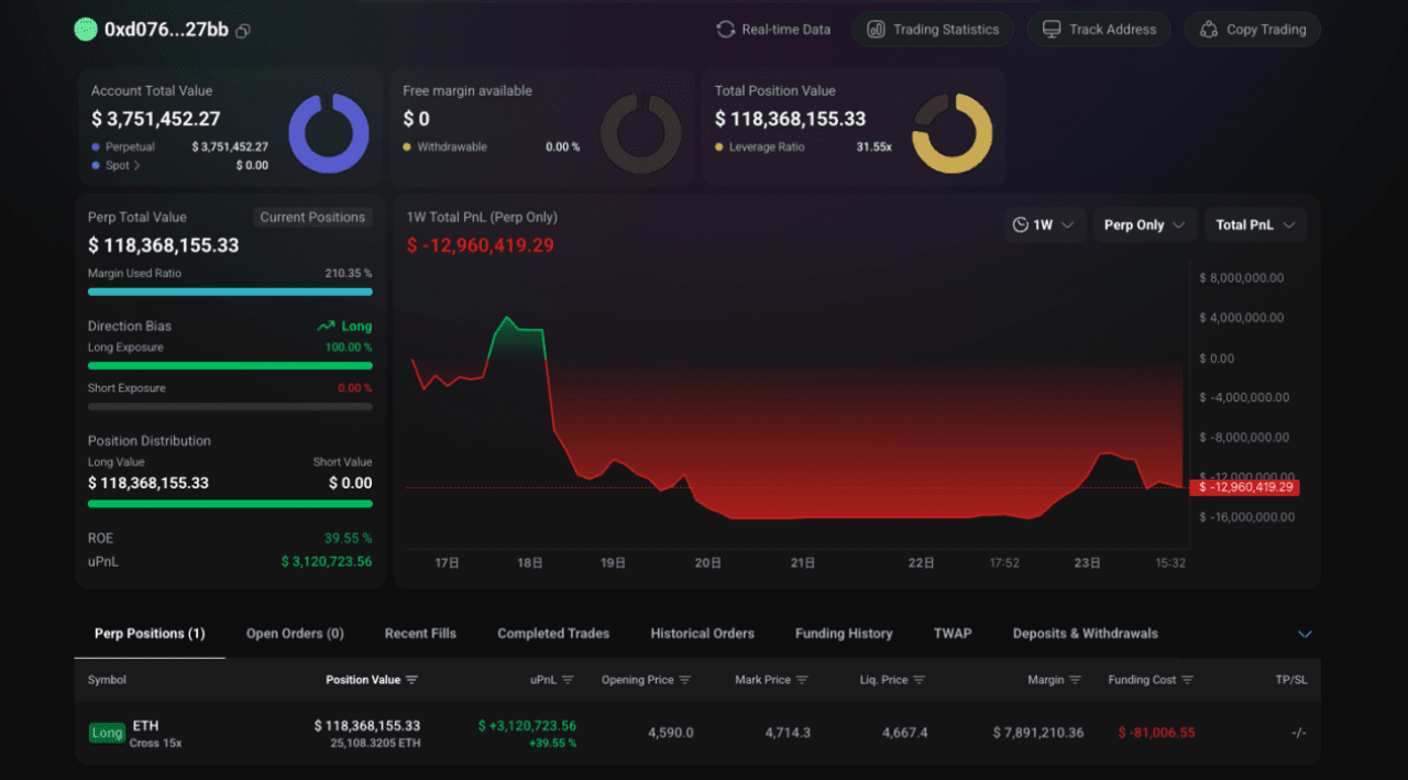 Hinter dem Durchbruch von ETH zu neuen Höhen stehen nicht nur makroökonomische Vorteile, sondern auch das aktive Engagement von Institutionen und großen Investoren. Seit Juni haben institutionelle Ethereum-Wallets fast 3 Millionen ETH gekauft, darunter Unternehmen wie BitMine Immersion und SharpLink Gaming. On-Chain-Daten zeigen, dass einige große Bitcoin-Investoren beginnen, ihr Portfolio zu wechseln: Ein Bitcoin-OG hat 300 BTC in ETH umgetauscht und hat über 160 Millionen US-Dollar Gewinn erzielt, hält jetzt 118.277 ETH und 135.265 ETH Long-Positionen.