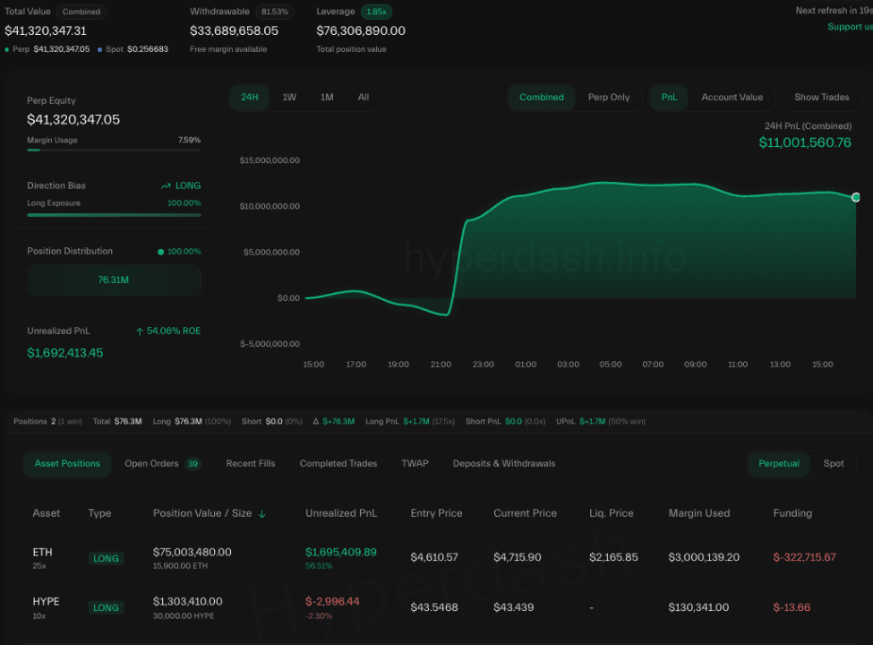 Ein weiterer Wal, der „125.000 US-Dollar für einen Long-ETH-Rolling Trade“ setzte, wettete vor der Rede auf eine Zinssenkung. Mit dem Anstieg des Preises stieg seine Position von 4.000 ETH auf 25.100 ETH, der Wert der Position beträgt 120 Millionen US-Dollar, und er hat einen Gewinn von 5,5 Millionen US-Dollar, der Liquidationspreis liegt bei etwa 4.666 US-Dollar. Der bekannte Investor Huang Licheng (Maji Dage) schloss BTC-, HYPE-, PUMP-, YZY-Long-Positionen (obwohl mit Verlust), behielt jedoch eine Long-Position von 25-fachem Leverage in ETH bei, mit einem Gewinn von über 3 Millionen US-Dollar und einem Gesamtgewinn von etwa 37 Millionen US-Dollar.
