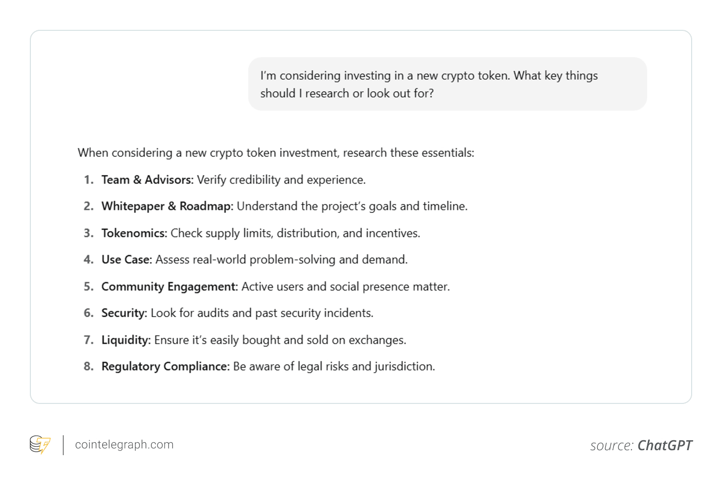 Beispielaufforderung: „Ich ziehe in Betracht, in einen neuen Krypto-Token zu investieren. Welche wesentlichen Dinge sollte ich recherchieren oder beachten?“