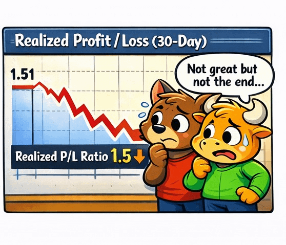Realized profit and loss metrics, especially on the 30- to 90-day window, have been trending down. One commonly cited ratio sits near ~1.5 and falling.