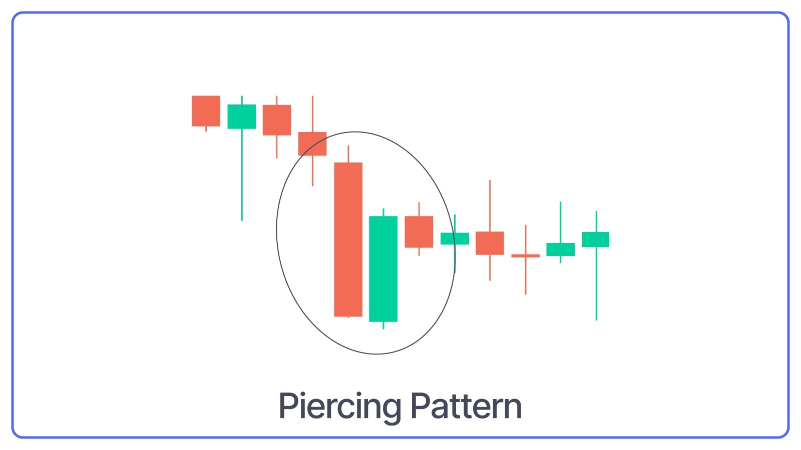 The Piercing Line is a two-candlestick pattern that begins with a strong bearish candle followed by a bullish candle. The second candle opens below the previous candle's close but closes above the midpoint (50%) of the previous bearish candle.