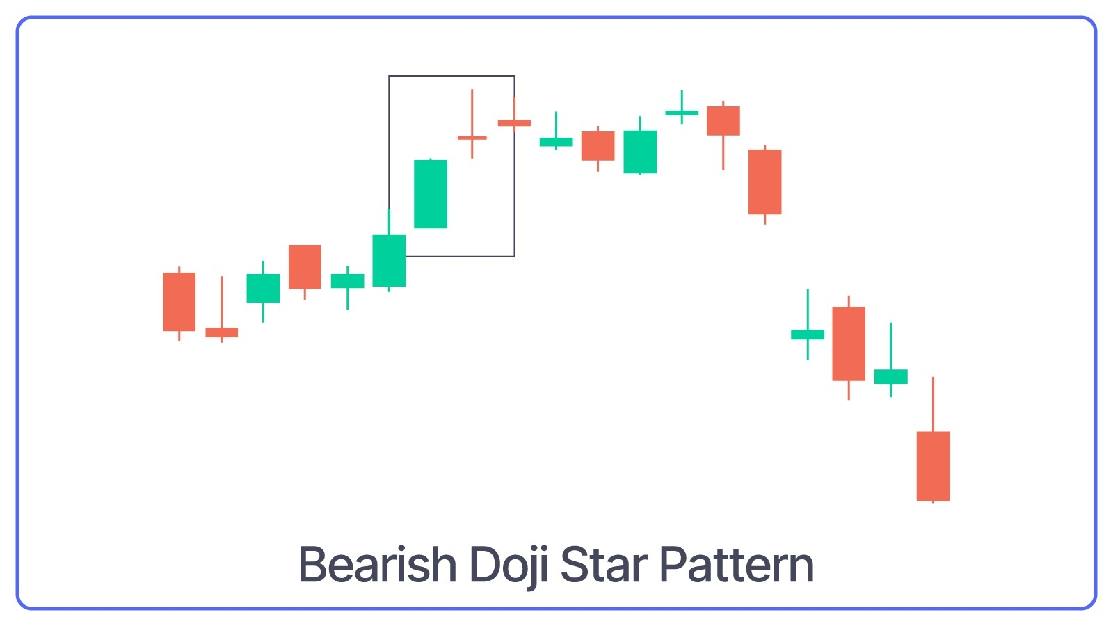 What Bearish Doji Star Pattern Indicates: The Doji shows indecision in the market, and if it's followed by a bearish candle, it confirms the reversal and signals a potential downtrend.