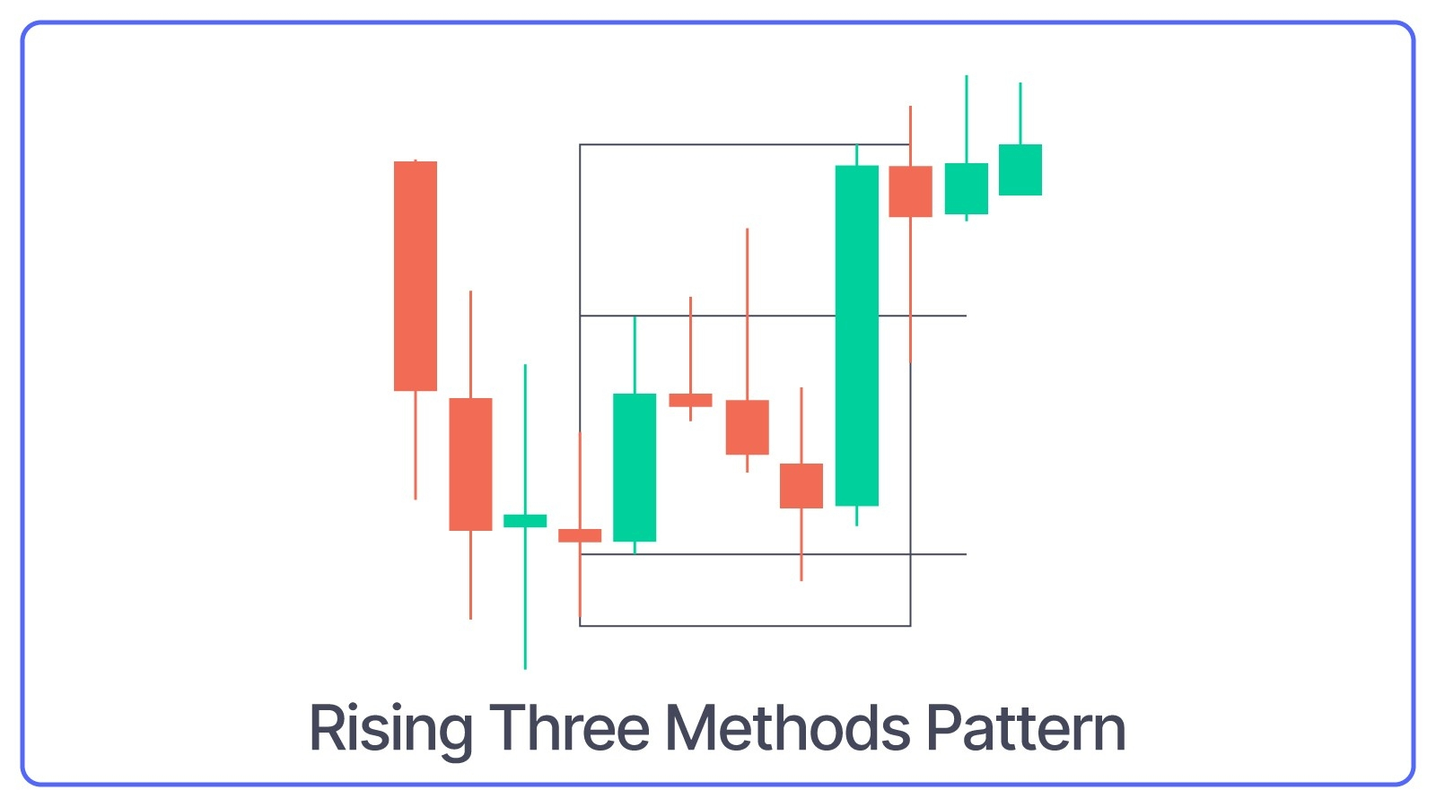 What Rising Three Methods Pattern Indicates: Uptrend is likely to continue. It means the price takes a short break or goes slightly down before it moves up again. The pattern suggests that buyers are still in control, and the price should go up after this small pause.