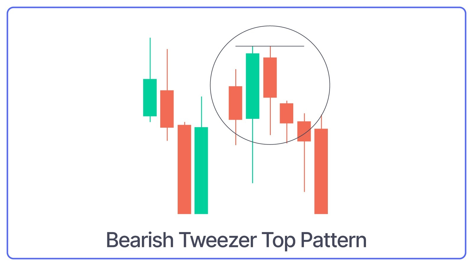 The Bearish Tweezer Tops pattern consists of two or more candles with matching highs and appears at the top of an uptrend. The first candle is usually bullish, and the second candle is bearish.