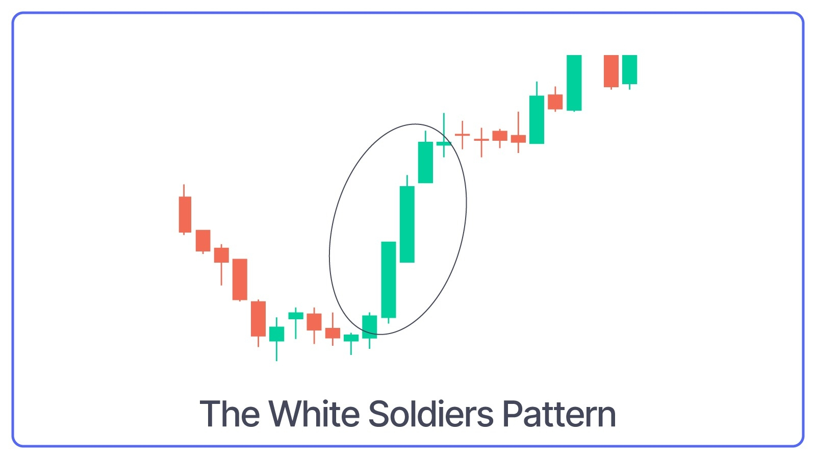 What Three White Soldiers Pattern Indicates: This candlestick pattern indicates that the market is moving from a downtrend (falling prices) to an uptrend (rising prices).
