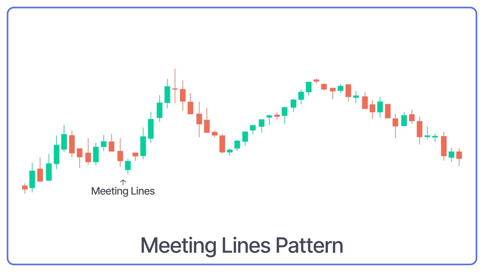 What Meeting Lines Pattern Indicates: Bullish reversal after a downtrend and indicates a shift from selling to buying pressure.
