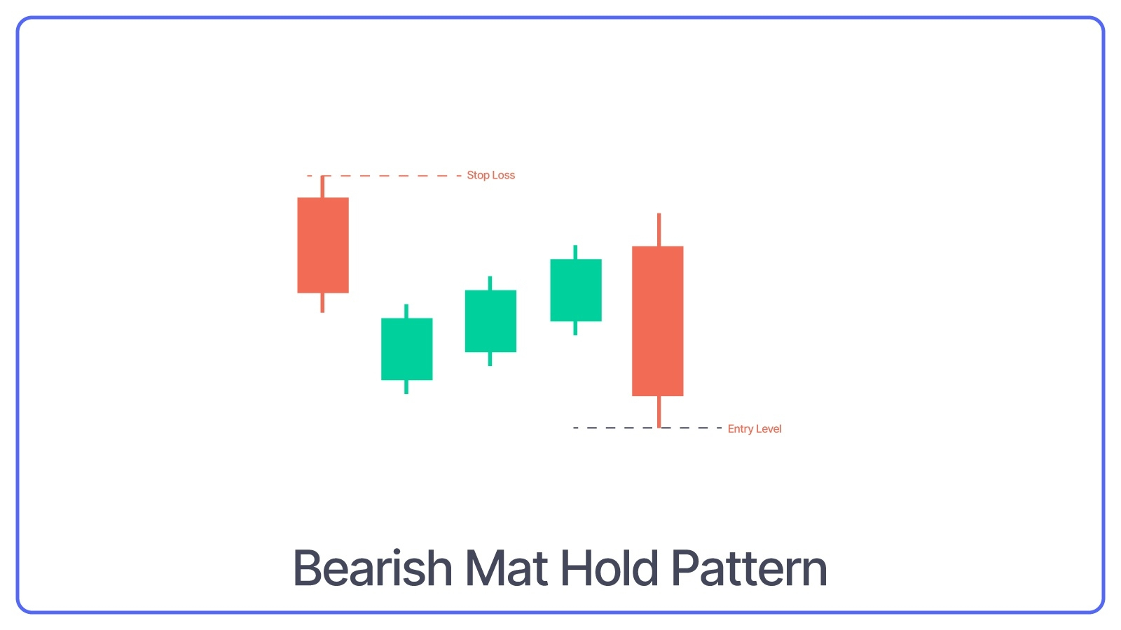 Bearish Mat Hold is a five-candlestick pattern that starts with a long bearish candle, followed by three smaller bullish candles that stay within the range of the first candle and ends with another long bearish candle that closes below the first candle.