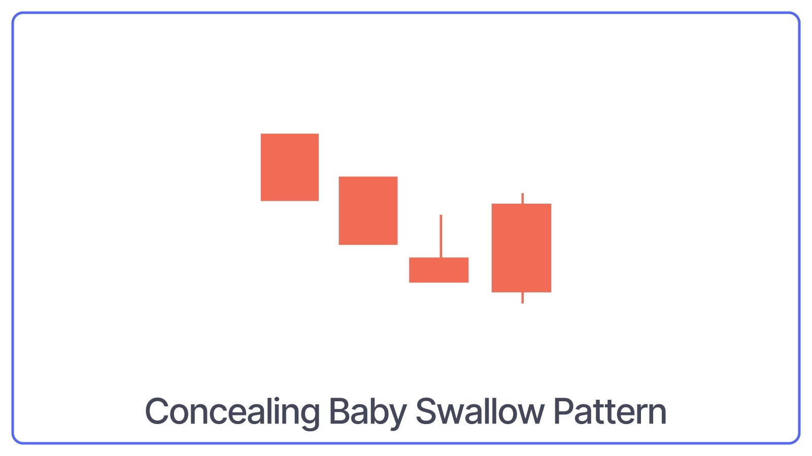 The Concealing Baby Swallow is a four-candlestick pattern that starts with two long bearish candles, followed by a gap down with a small bullish or bearish candle and ends with another long bearish candle that completely engulfs the small candle.