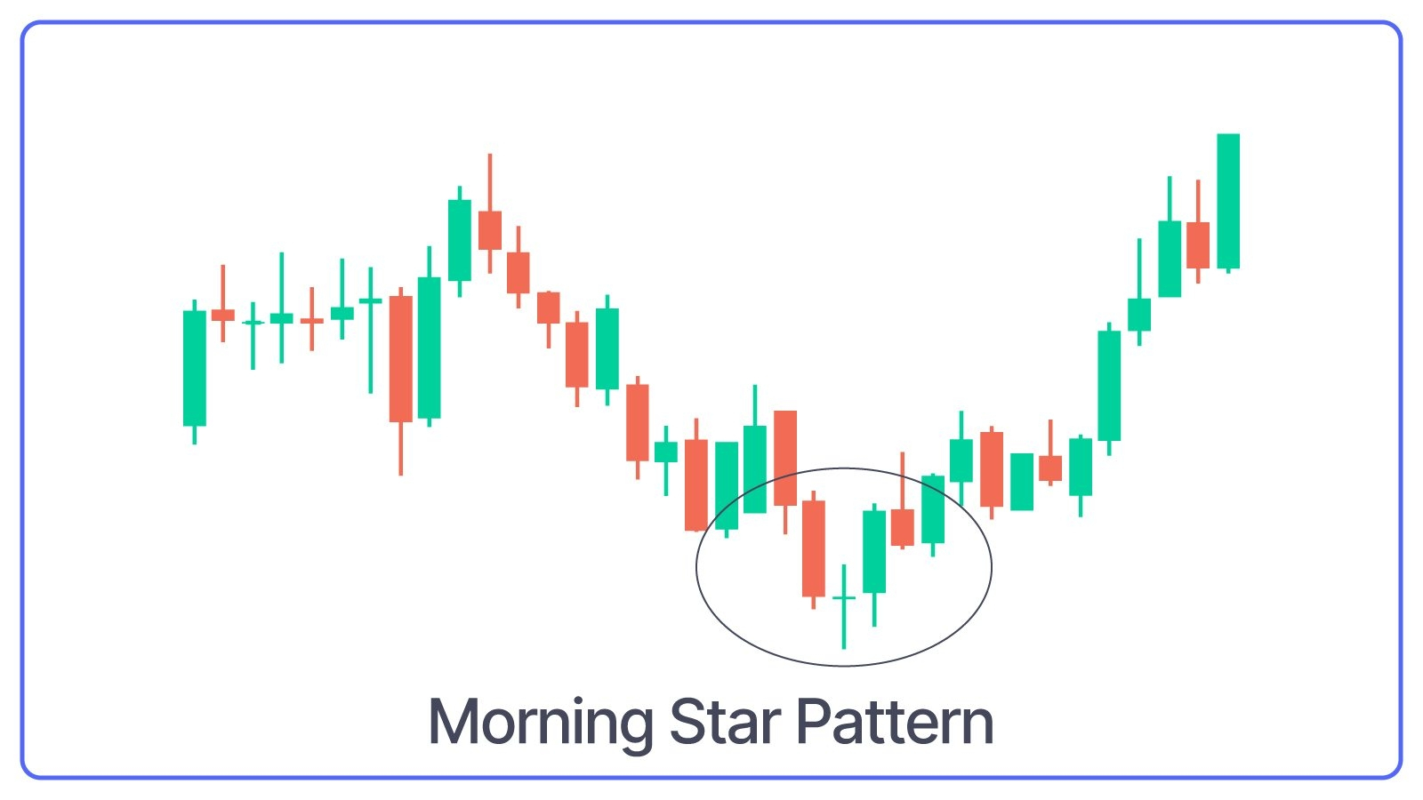 The Morning Star is a three-candlestick pattern that converts downtrend to uptrend. It starts with a long bearish candle, followed by a small-bodied candle (either bullish or bearish) and ends with a long bullish candle.