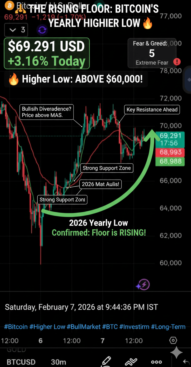 While the headlines are screaming about "Extreme Fear" and short-term price drops, smart investors are looking at a much more powerful metric: The Yearly Higher Low. Despite the recent volatility, Bitcoin has maintained a price floor significantly higher than last year’s lowest point. Here is why this matters more than the daily "red" candles.