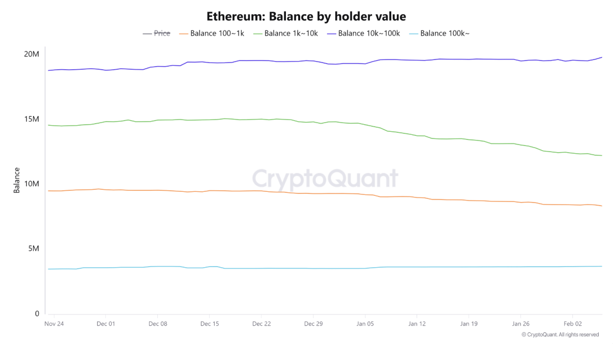 Không chỉ các “ông lớn”, làn sóng bán tháo còn lan rộng trong nhóm nhà đầu tư nhỏ lẻ. Các ví nắm giữ từ 100–1.000 ETH và 1.000–10.000 ETH đã đồng loạt xả hàng, với tổng lượng ETH bị bán ra lên tới khoảng 820.000 ETH chỉ trong vòng một tuần, phản ánh áp lực cung đang đè nặng lên thị trường.