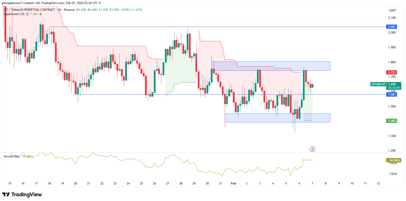 Trên khung thời gian 4 giờ, LIT đã bứt lên trên đường SuperTrend, cho thấy lực mua từ phe bò đang dần quay trở lại. Tuy nhiên, chỉ báo Accumulation/Distribution lại hé lộ thực tế rằng khoảng 94,88 triệu LIT đang trong quá trình phân phối, cho thấy áp lực xả vẫn chưa hề suy giảm.