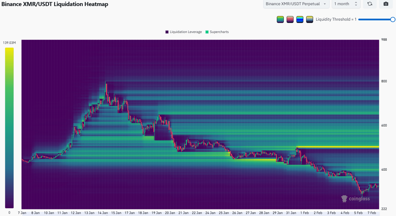 Đợt tăng trưởng của XMR đã chính thức kết thúc. Một đợt phục hồi của Bitcoin có thể hỗ trợ XMR tăng trở lại, nhưng bản đồ nhiệt thanh lý cho thấy các mức giá $390-$420 và $500 là những vùng từ tính tiếp theo cần chú ý.
