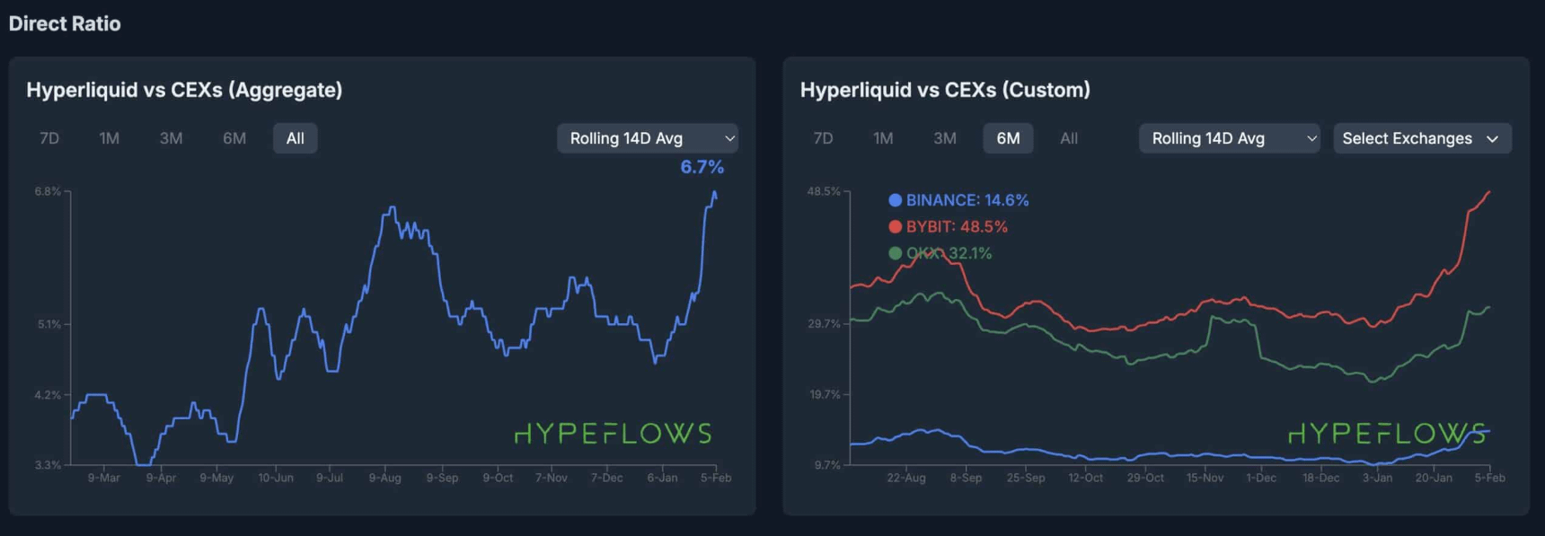 Dẫu vậy, cơn sốt RWA đã giúp Hyperliquid đưa thị phần giao dịch hợp đồng vĩnh cửu lên mức cao kỷ lục 6,7% – một tín hiệu cảnh báo rõ ràng dành cho các sàn CEX truyền thống.