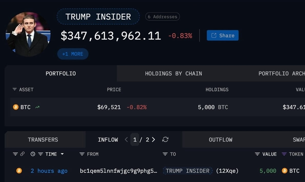 就在刚才,一条突发新闻震动了加密世界:一位沉寂数月、关联美国总统特朗普的巨鲸突然激活钱包,狂扫5000枚比特币,价值约3.5亿美元。这不仅是简单的买入——更是在市场连续回调中,一次精准的“恐惧时刻”重仓押注。