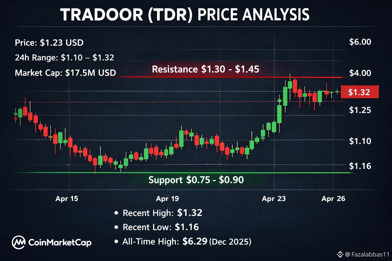 #TRADOOR Based on the most recent public price data, TRADOOR is trading around $1.20–$1.25 USD with its 24-hour range roughly $1.10 to $1.32 USD and a market cap near $17–18 million USD. The price remains significantly below its all-time high of about $6.29 USD (Dec 2025). �