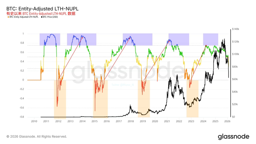 Das zeigt auch, dass der Rückgang am 6. Februar eher wie ein Rückzug des Risiko-Marktes + eine Hebelbereinigung aussieht, als eine panikartige Bodenbildung im on-chain Sinne. Da LTH-NUPL in den gelben Bereich eingetreten ist, repräsentiert der Kernzustand nicht, dass langfristige Anleger systematisch Verluste erleiden, sondern dass die Gewinne langfristiger Anleger beginnen, komprimiert zu werden, während sie insgesamt weiterhin im Gewinnbereich bleiben.
