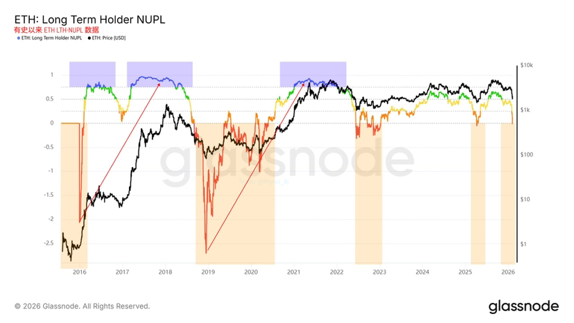 Im Vergleich zu $BTC hat $ETH in diesem Rückgang bereits Bärenmarktmerkmale gezeigt. Es ist nicht nur in den orangefarbenen Bereich eingetreten, sondern am 5. Februar, als der Preis bei etwa 1.800 USD lag, gab es auch ein rotes Kaufzeichen. Ähnlich wie bei Bitcoin sind die Daten von Ethereum's LTH-NUPL ebenfalls einige der sehr genauen Kaufindikatoren.