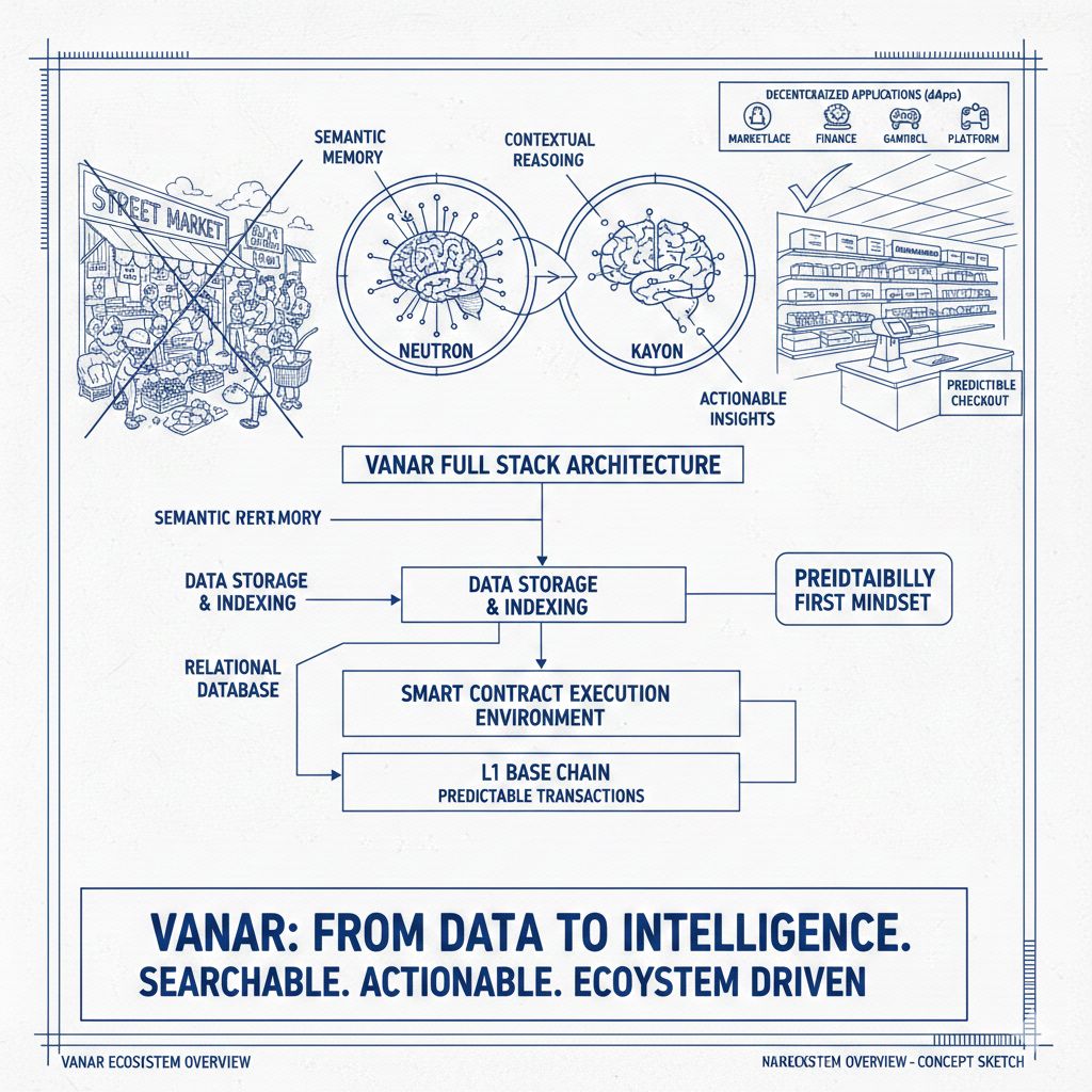 That “predictability first” mindset shows up in the way Vanar talks about itself: not just a base chain, but a full stack where data isn’t treated like dead storage. On Vanar’s own architecture pages, the emphasis is that the chain should understand what it stores Neutron as “semantic memory” and Kayon as “contextual AI reasoning,” with the bigger idea being: don’t just record transactions, make the information behind them searchable and actionable inside the ecosystem.