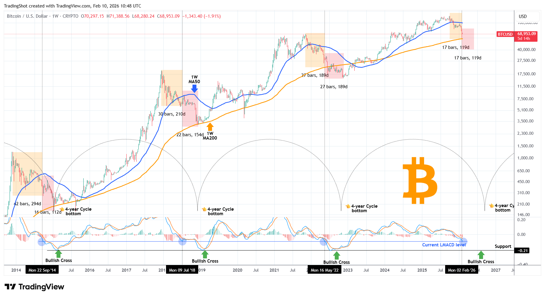 Infolgedessen, da in der letzten Woche 17 Wochen seit dem Zyklus-Hoch bis zum LMACD-Kontakt vergangen sind, könnte der Zyklus in den nächsten 17 Wochen (basierend auf diesem Modell) seinen Tiefpunkt erreichen. Das deutet auf die erste Woche im Juni 2026 hin, während der 4-Jahres-Zyklus Mitte September vorschlägt. Was denken Sie, was wahrscheinlicher ist? Könnte das der kürzeste Bärenzyklus von BTC aller Zeiten sein?