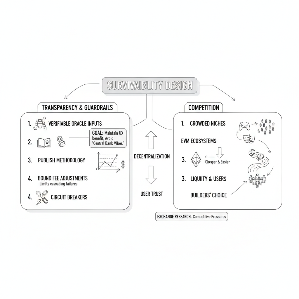 The survivability version of that design is transparency and guardrails: use verifiable oracle inputs, publish the methodology, bound the rate of fee adjustments, and add circuit breakers so one bad input can’t distort the whole network. The trick is keeping the UX benefit without inheriting “central bank vibes.”
