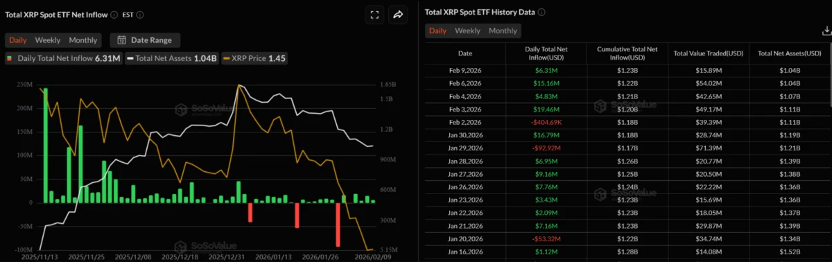 ETF XRP spot AS saat ini memiliki aset bersih lebih dari US$1,04 miliar secara total. ETF XRP ini sudah diperdagangkan selama 56 hari, dan hanya mencatatkan arus keluar pada 4 hari saja.